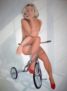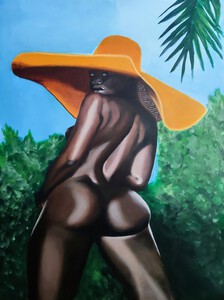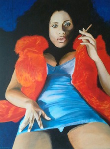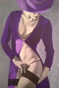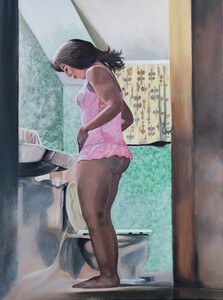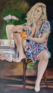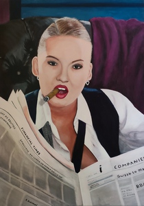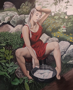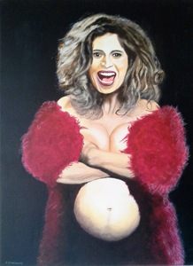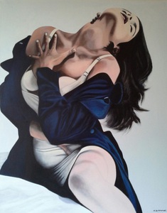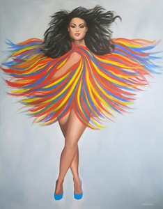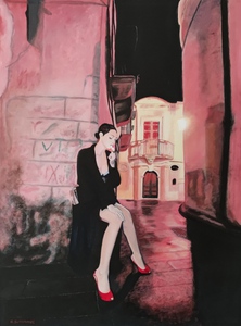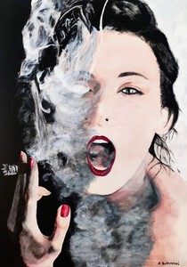 2019De centrale figuur is een vrouw met een half wit geschminkt gezicht en een traan onder haar oog, wat doet denken aan een pierrot of clown. Ze draagt een grote witte plooikraag, een kanten bralette en grijze shorts met linten,aangevuld met rood-witte gestreepte kousen en rode puntige schoenen.De vrouw is geplaatst binnen een lichtgekleurde, ovale vorm die een cocon suggereert. Haar houding is expressief, met één arm omhoog en de andere langs haar lichaam. Het schilderij is een portret met elementen van symboliek en theatraliteit, verwijzend naar thema's als dualiteit of kwetsbaarheid
